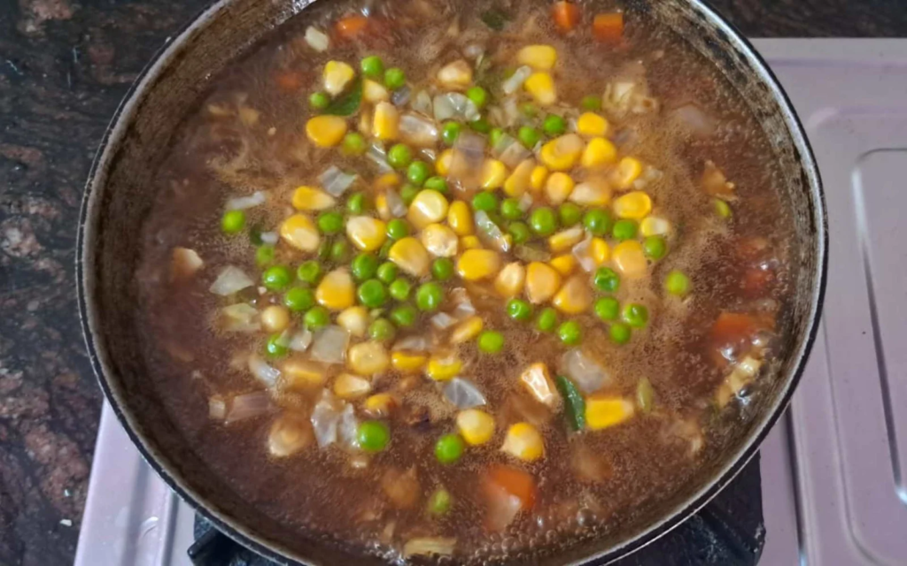 - Once this rolling boil appears, wait till the corn starch loses its colour and the soup gets a dark colour from the soya sauce.